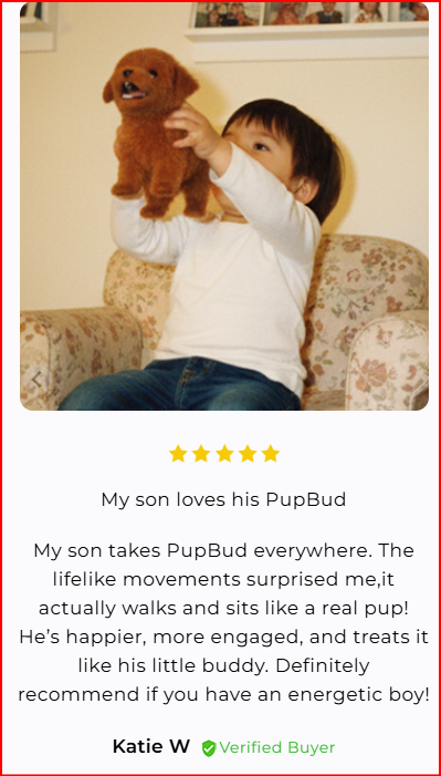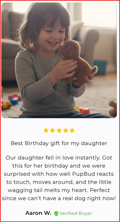 Yes! PupBud walks forward, wags its tail, nods its head, and makes playful barking sounds. Kids love how lifelike and expressive it feels — it’s the closest thing to having a real puppy without the mess.